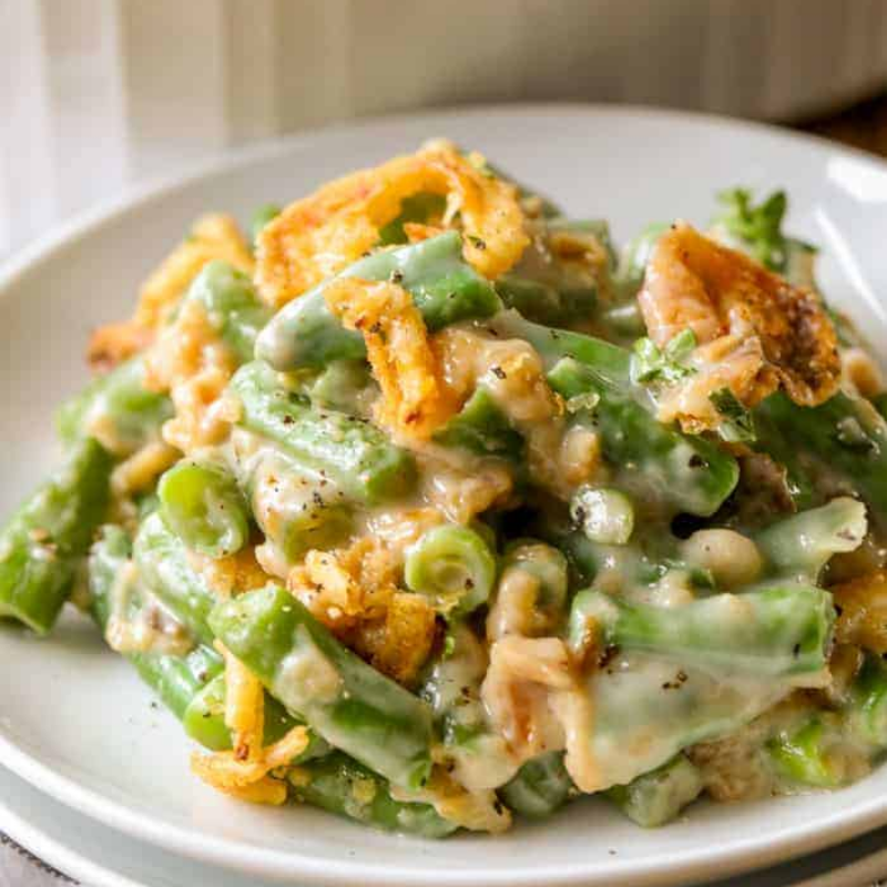 “Tender green beans are tossed in a delicious creamy sauce, cheese, crispy onions, and baked with even more crispy onions until hot and bubbly.”